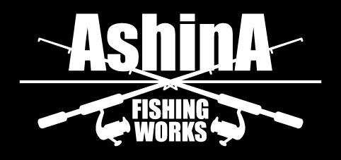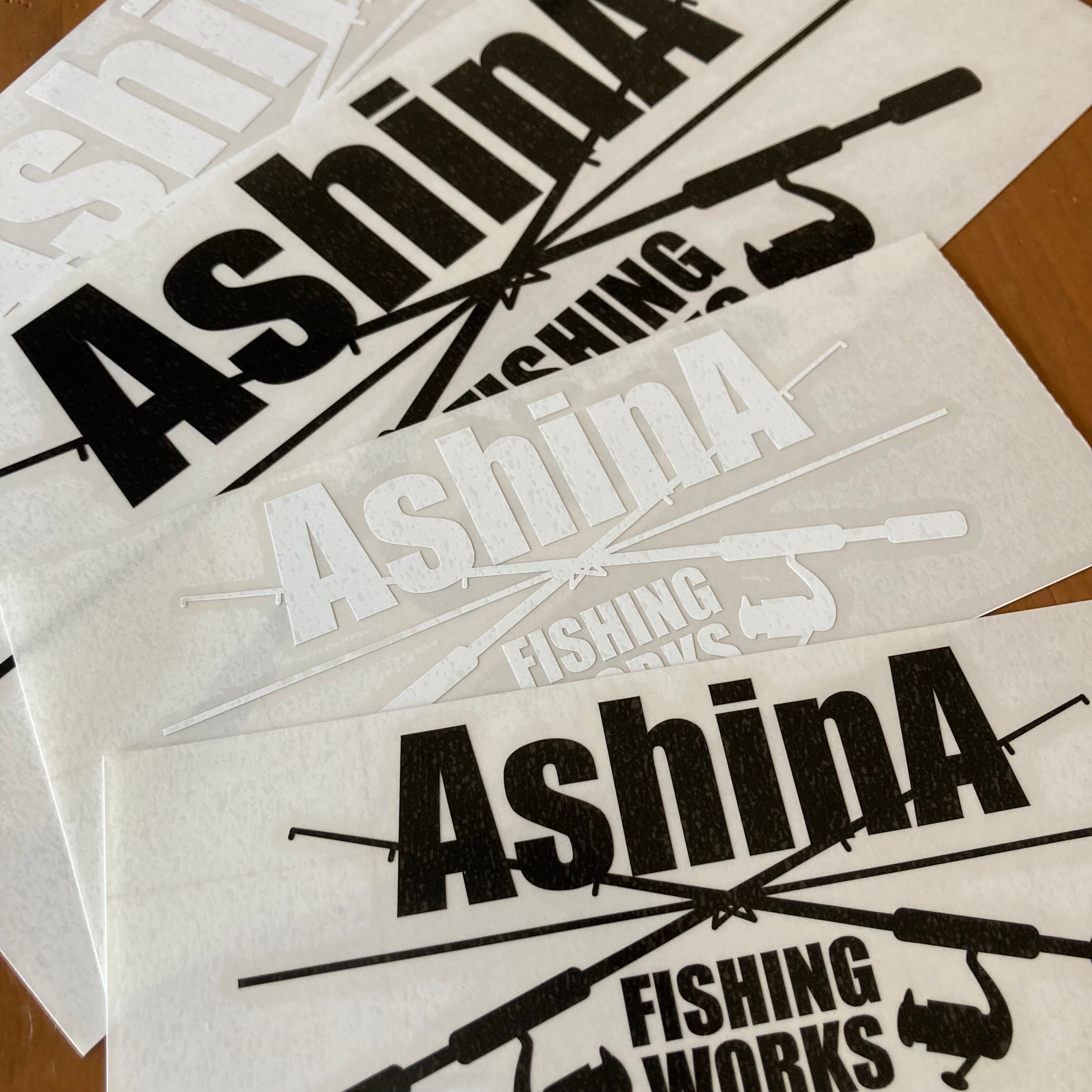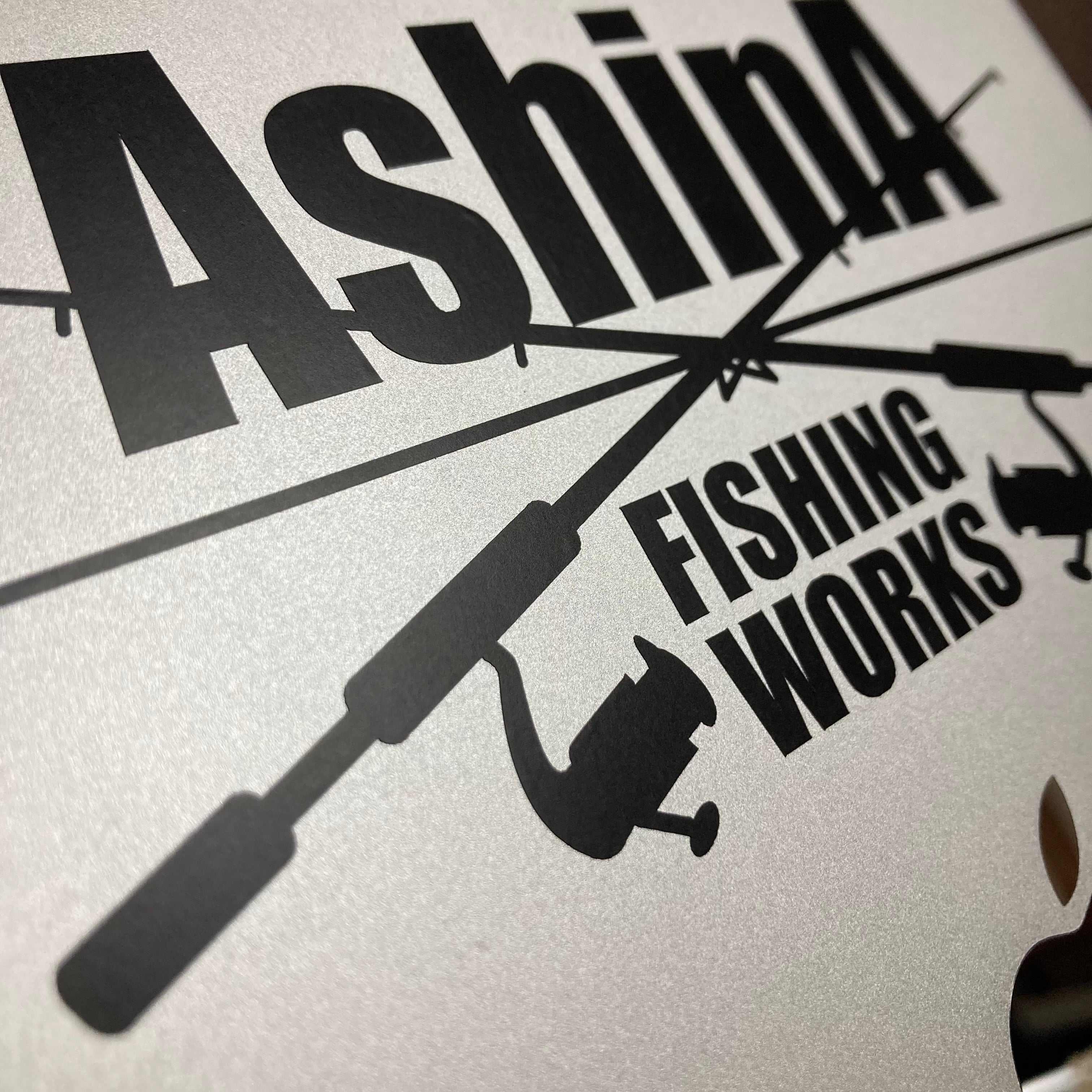 AshinA fishing worksロゴのカッティングステッカー。耐久性のある素材のため、屋外使用にも向いております。